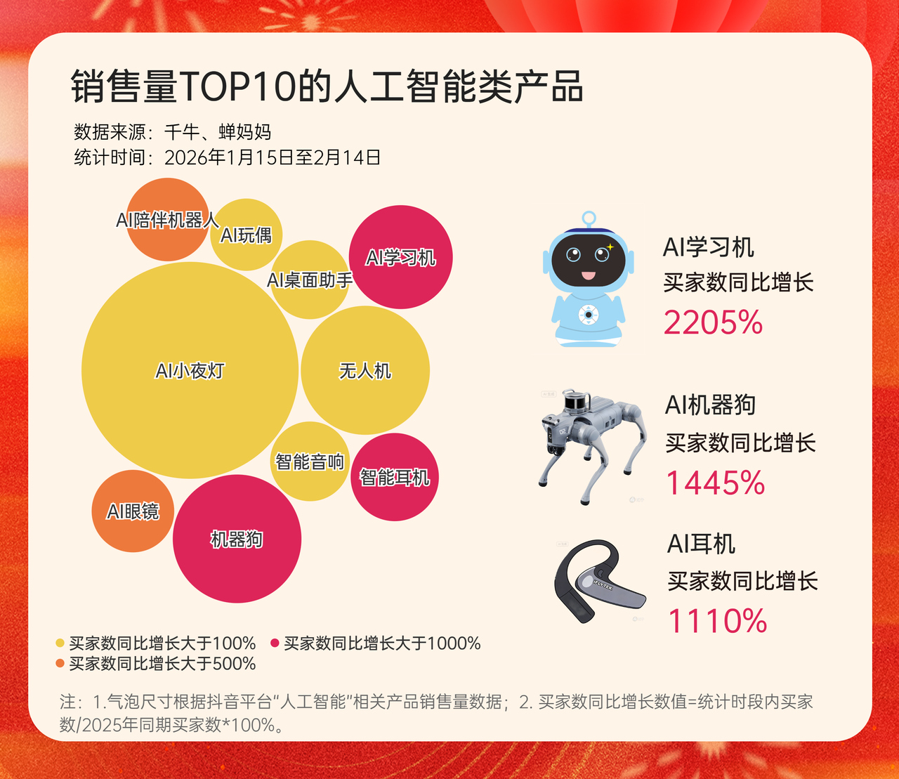 蝉妈妈数据显示,近一个月,仅抖音平台,与“人工智能”相关的产品销量就超25万件,总销售额在7500万至1亿元区间内。就具体类别而言,AI小夜灯、无人机、机器狗等产品销量位列前十,多款销量破万。另据千牛平台数据,与2025年同期相比,消费者对上述10类产品的关注度均有所增长,AI学习机的买家增长最为显著,达到2205%,AI机器狗、AI耳机的买家增长也超10倍。