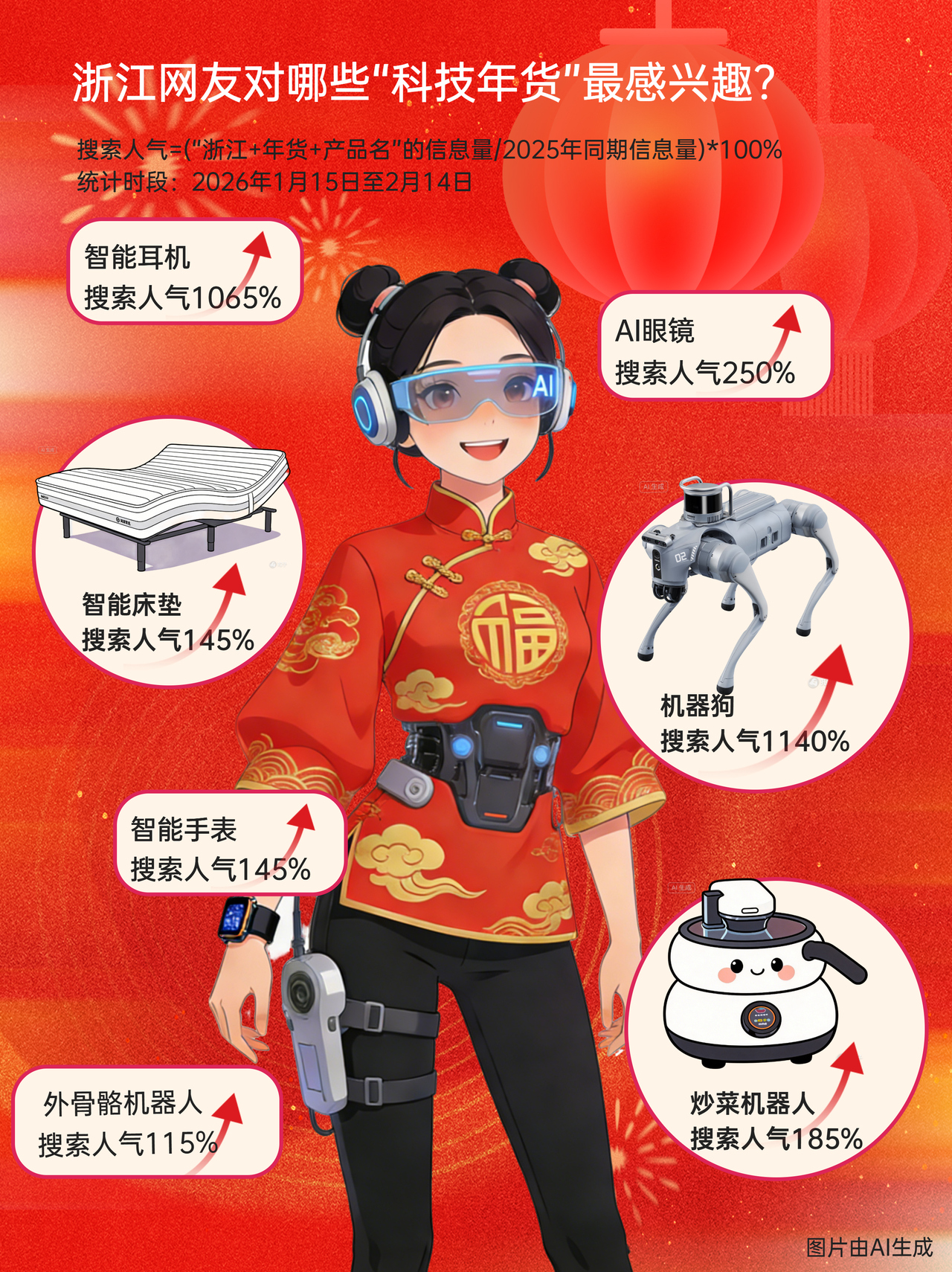 从搜索人气看,除机器狗、AI眼镜、智能手表等产品外,炒菜机器人、智能床垫等也成为浙江消费者的“心头好”,搜索人气较2025年同期增长均超100%。如主打“多功能”“自清洗”“自动翻炒”的炒菜机器人,购买人群中来自浙江的消费者占比9.51%,位居全国首位。