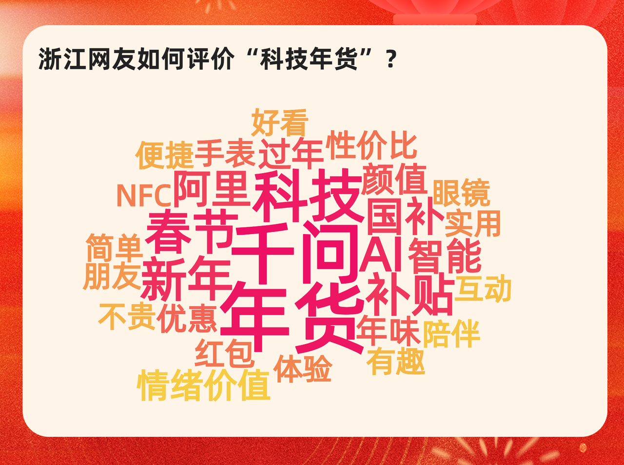 为何选择“科技年货”?我们抽样了1000条浙江网友的评论发现,“补贴”(27.55%)、“好看”(18.15%)、“实用”(16.89%)等是网友选择的核心考量。