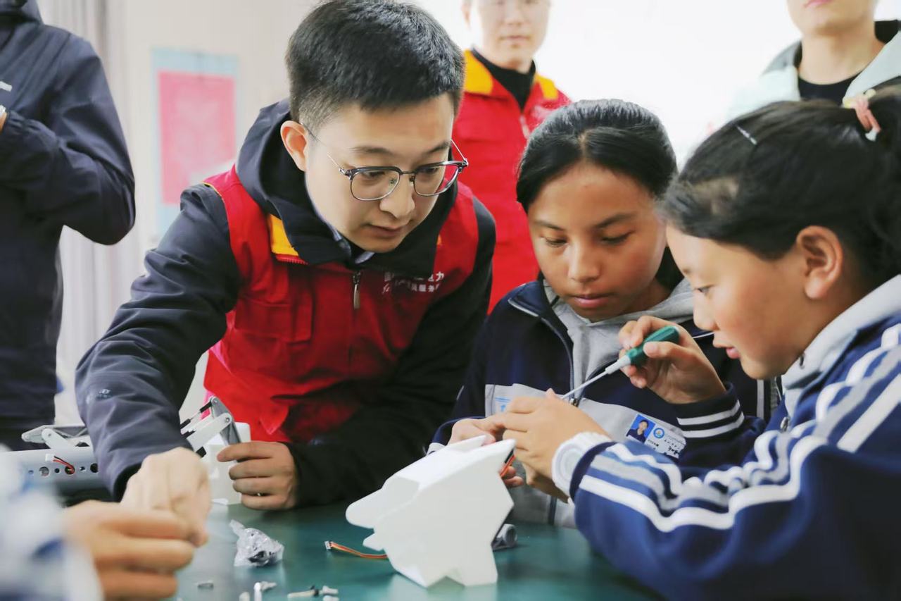 “点亮玉树”志愿者在教学生们组装机器狗。姚靖林/摄