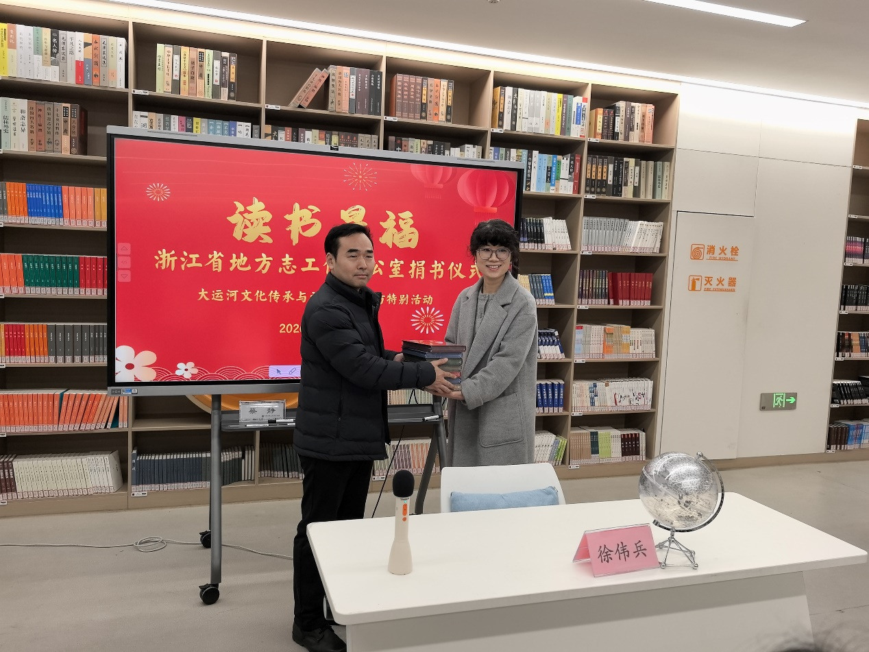 在“读书是福”图书捐赠环节,浙江省方志办副主任袁新国在祥符街道领导和40多位学生、家长的共同见证下,将浙江省方志办最新的研究成果——《浙志雅集》系列丛书交到了余琴老师手中。他寄语小朋友能够多读书,读好书,并希望小朋友能够从这套文化丛书中了解方志里的浙江、方志里的祥符,多了解中华优秀传统文化。