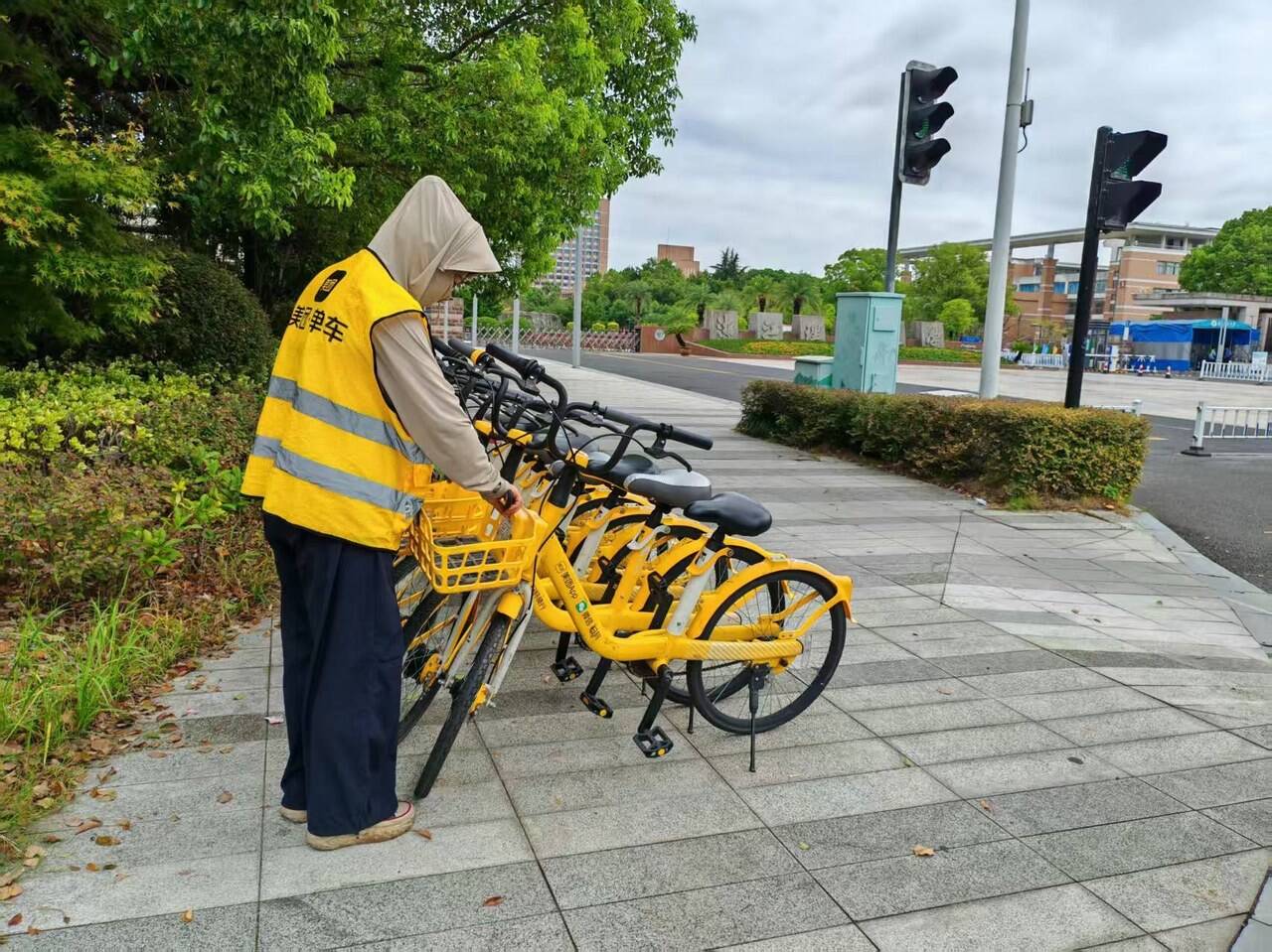 在车辆整理摆放方面,企业加大了运维力度。针对高校附近诸如杭州传媒学院南门、财经大学西门等容易出现车辆堆叠的重点区域,增派运维人员,采用专人执勤与点位巡检相结合的方式。他们将随意停放的单车搬运至指定停车区域,并按照车头一致、排列整齐的标准进行摆放,校园周边交通秩序得到显著改善。