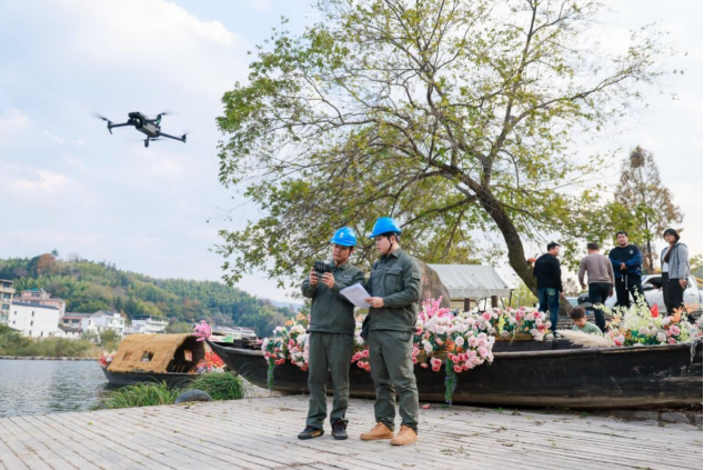 源头村坐落于楠溪江畔,是永嘉近年来重点打造的文旅新地标。冬季游客渐多,沿河景观、民宿、特色店铺等用电负荷持续增长。为保障景区电力稳定,国网温州供电公司组织人员对重点区域线路开展精细化巡查。工作人员借助无人机对河岸沿线和树木遮挡区域进行空中巡视,全面掌握线路运行情况;同时对景区商铺、民宿的电表箱、接户线和用电环境进行逐一排查,消除潜在隐患,确保文旅设施安全可靠供电。