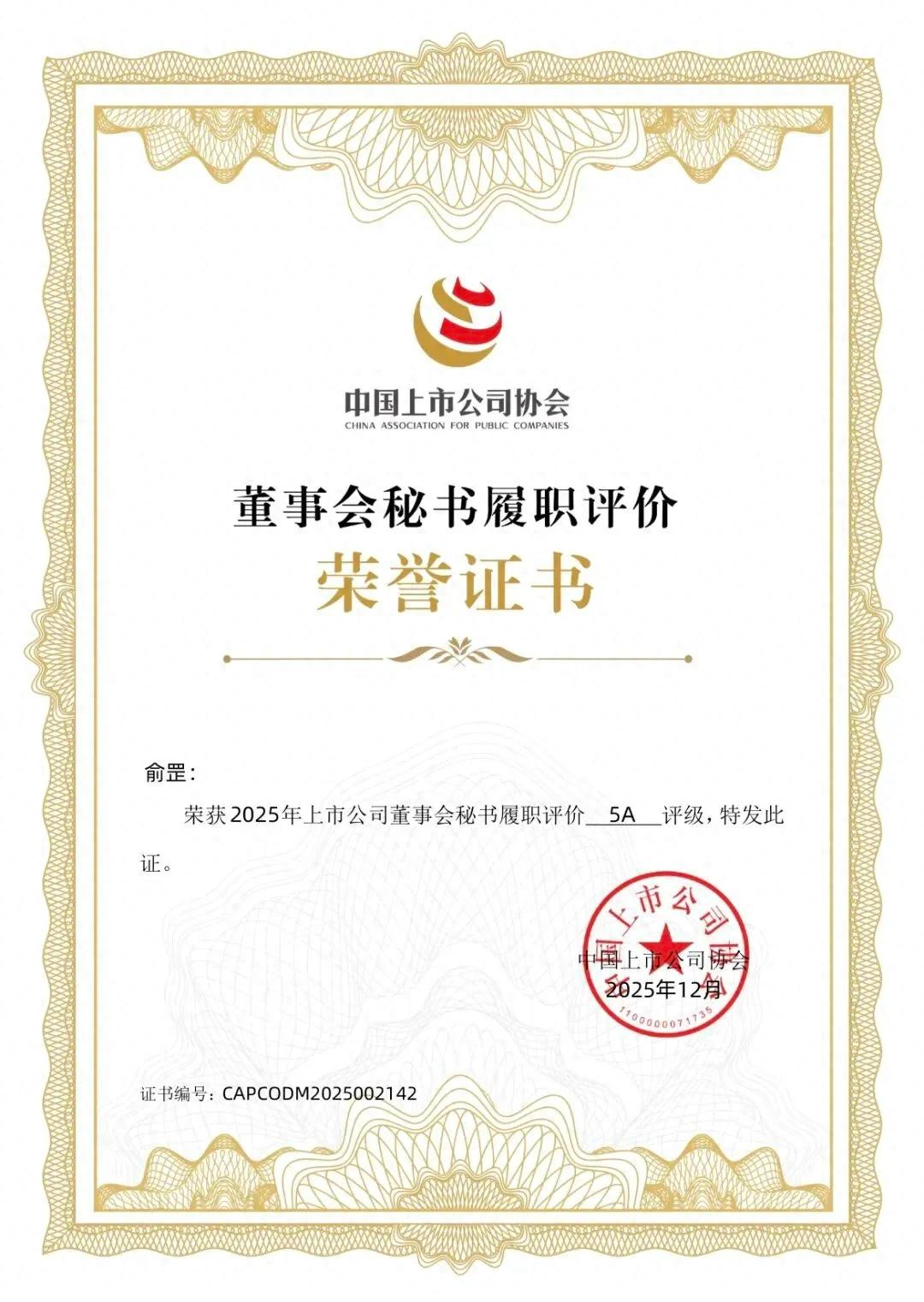 浙江在线12月30日讯(通讯员 雷琳)日前,中国上市公司协会正式发布“2025年上市公司董事会秘书履职评价”结果。凭借在信息披露、规范运作、维护投资者关系等方面的优异表现,宁波银行董事会秘书再次荣膺“5A董秘”称号,系连续第四年斩获该项荣誉。